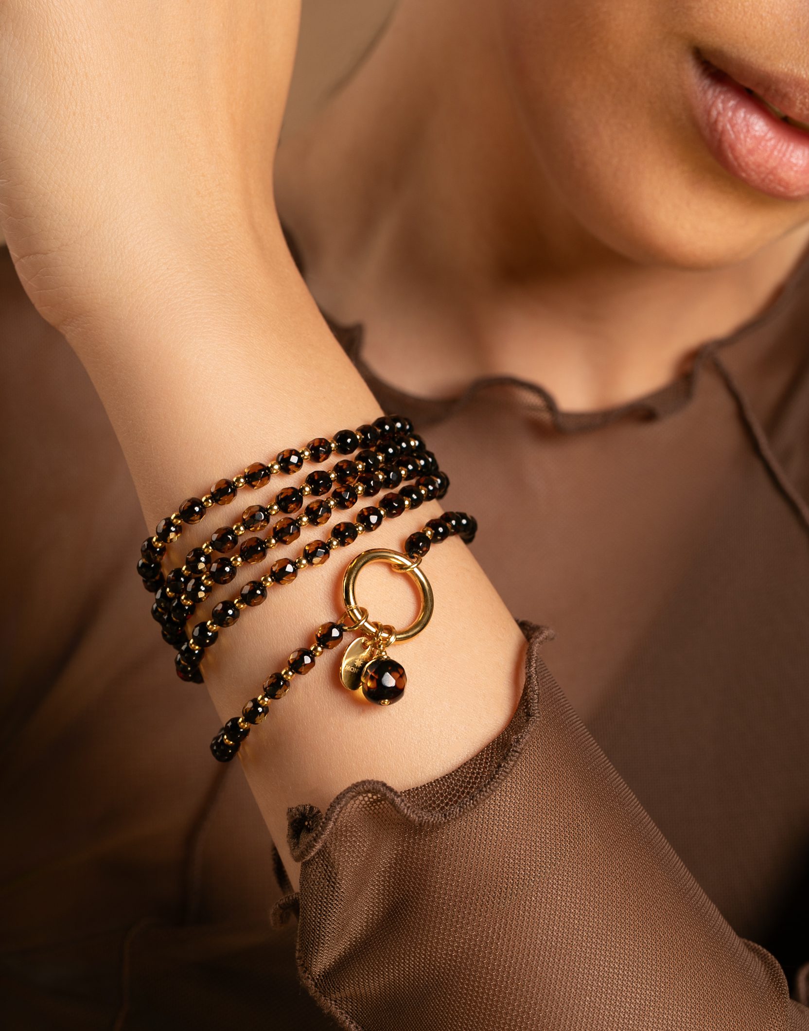 BLISS faceted amber beaded necklace-bracelet, featuring its delicate design, is a versatile and elegant piece of jewelry. By selecting the right size for your wrist, you can wear it as a four-row bracelet (simply unclip the round gold-plated ring and wrap the amber crystal necklace around your wrist four times) or as a medium-length amber necklace. Faceted amber beads may appear as a dark cherry, almost black shade on one side, and subtly green or a transparent honey hue shade on the other side. Carefully selected amber beads create a unique modern amber necklace and reveal the special beauty of amber. BLISS small amber necklace for women is a perfect gift for yourself or a loved one, embodying the eternal synthesis of nature and beauty.