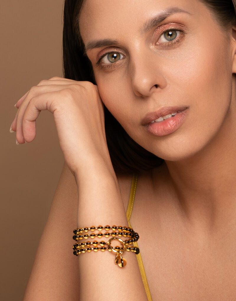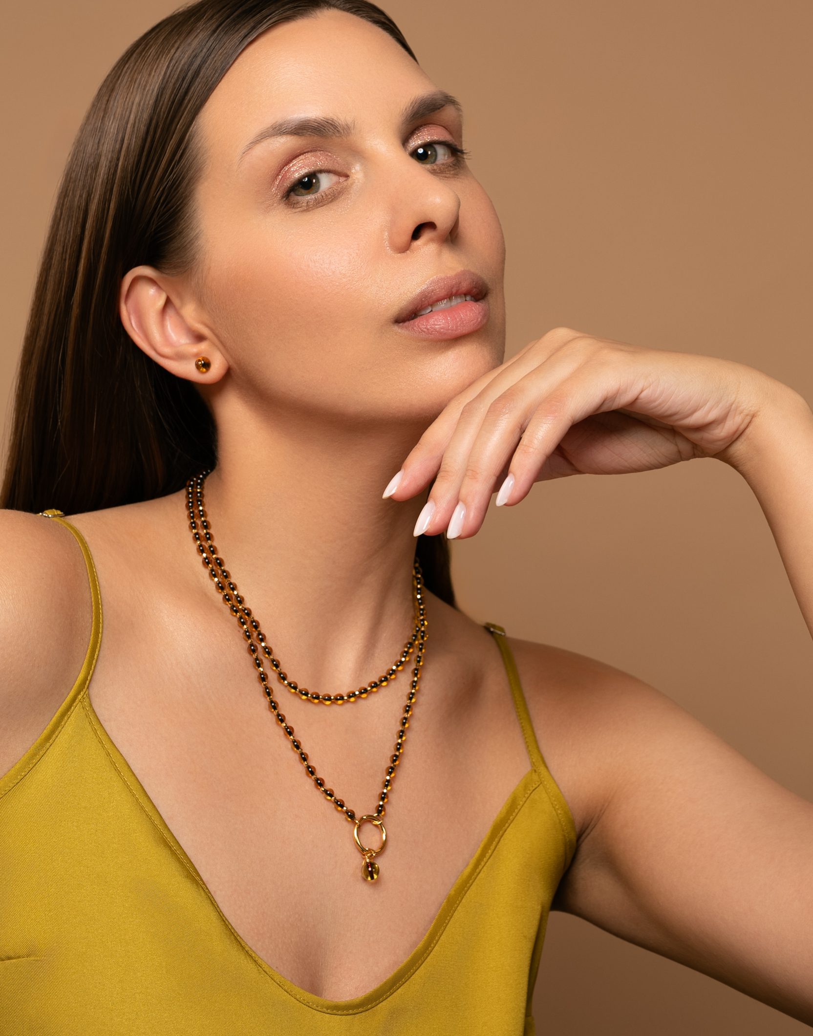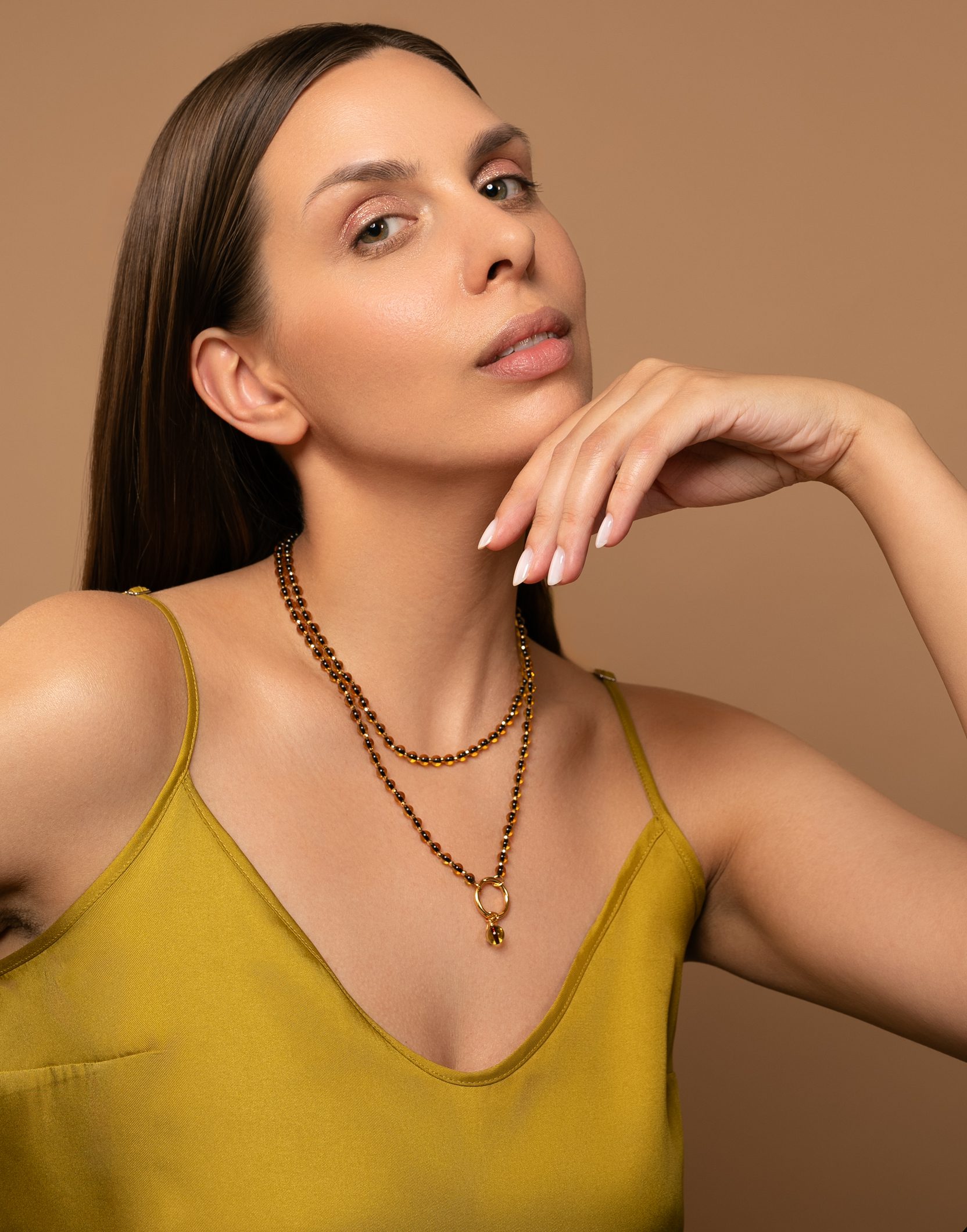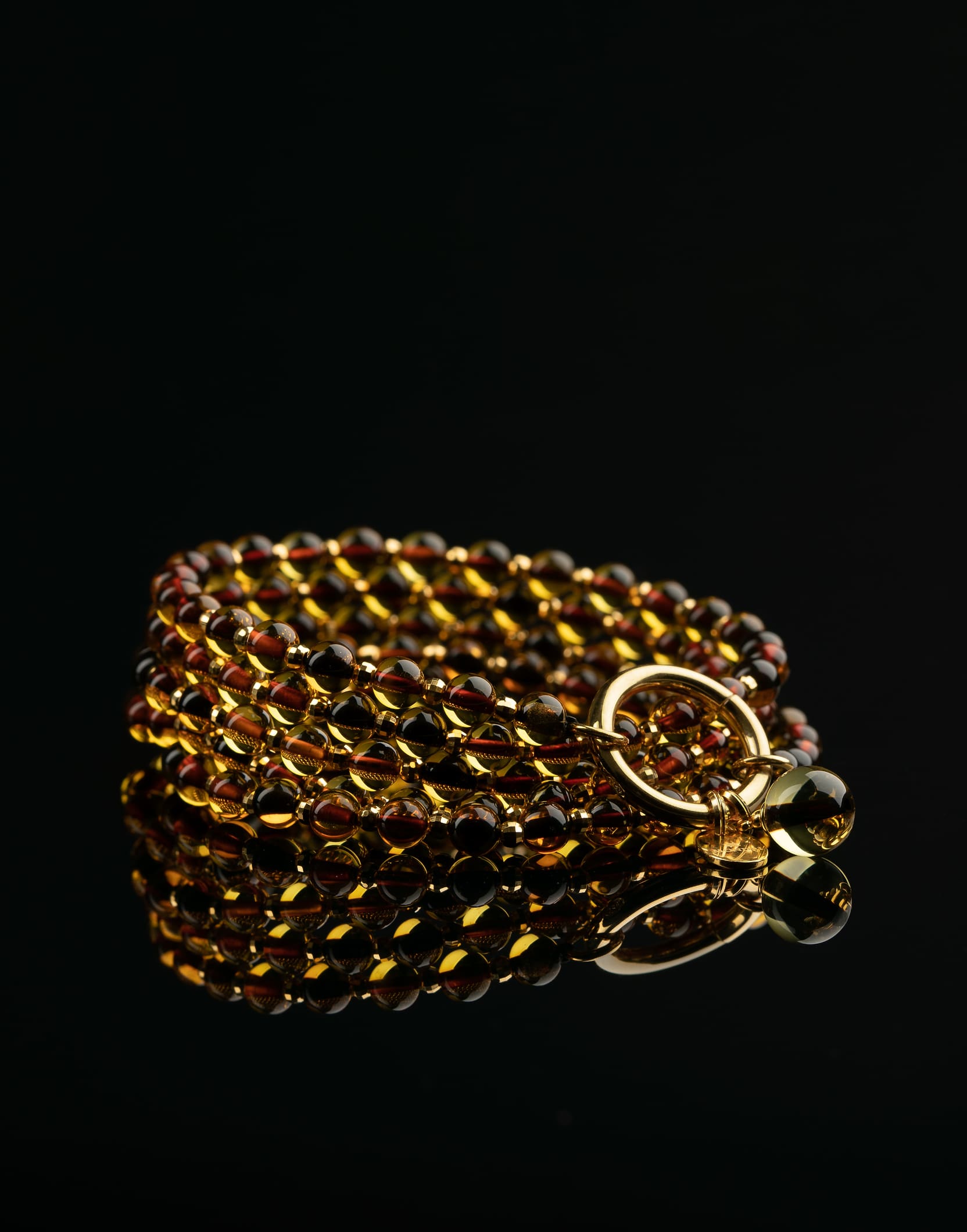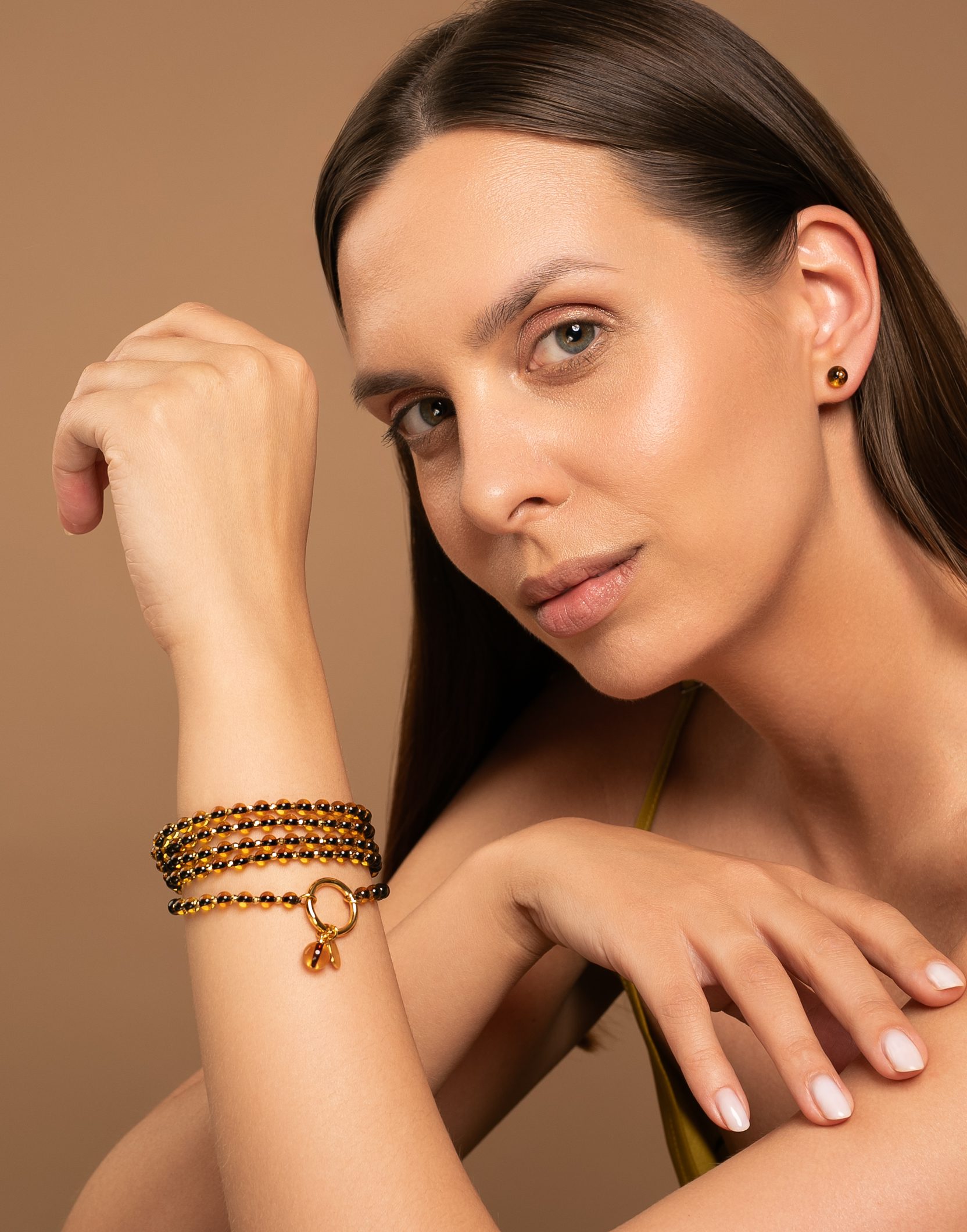 Long amber bead necklace-bracelet, TIGER, is a delicately designed and versatile piece of jewelry that exudes elegance. Depending on the size you choose for your wrist, it can be worn as a five-row bracelet (just unclip the round gold-plated ring and wrap the small amber necklace around your wrist five times), as a long amber necklace, or even as a double beaded necklace around your neck. Within the yellow amber necklace, a darkened core creates depth and mystery, which at certain angles reveals an uncanny resemblance to the pupil of a tiger’s eye. This amber crystal necklace adds refinement and elegance to any outfit. Round amber beads necklace for women will appeal to all who appreciate classic and subtle style.