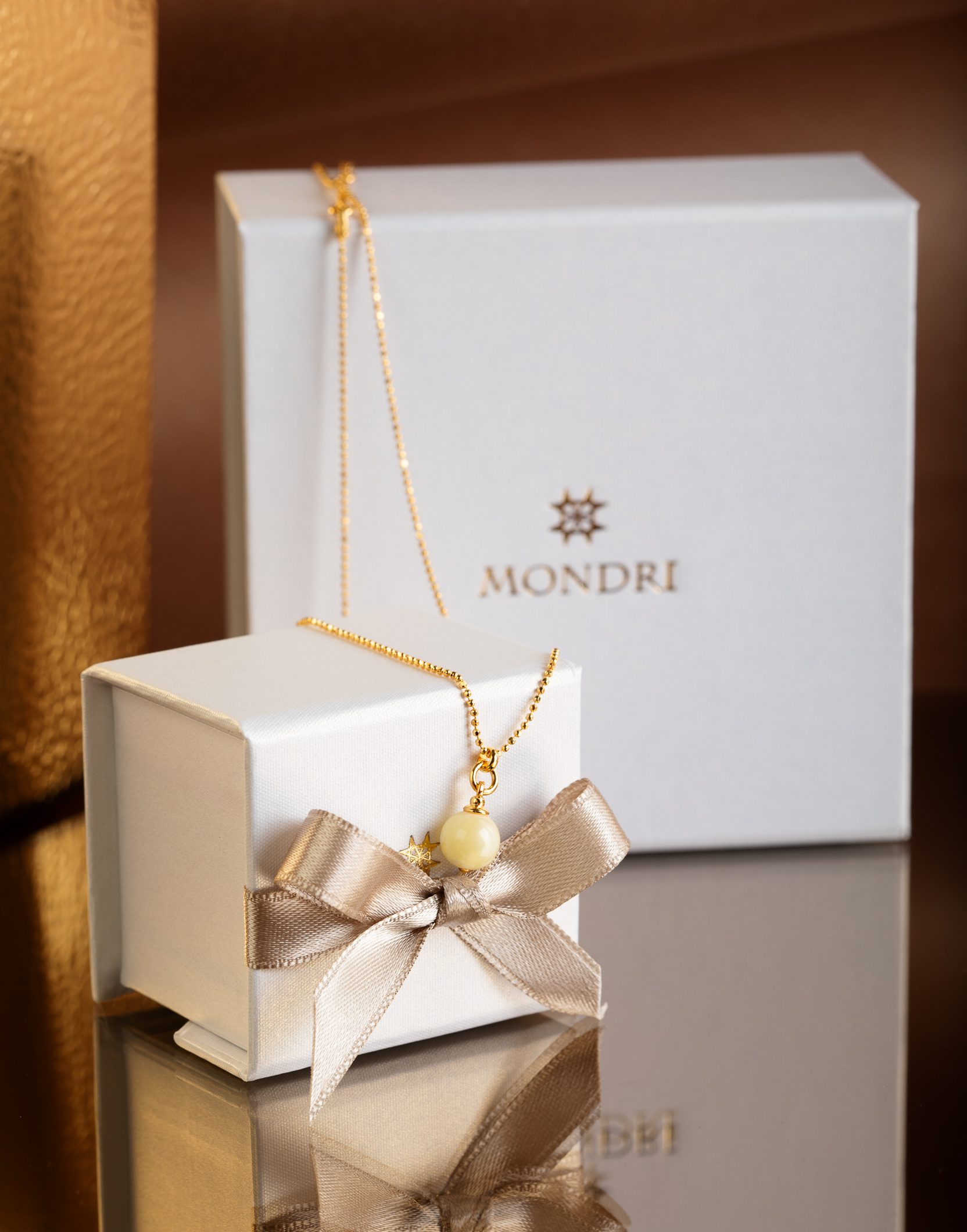 In order for you to be able to give the chosen piece of jewelry as a gift right away, we will pack it for free. The jewelry will reach you nicely packed in a branded MONDRI box, which will be wrapped in gift paper and tied with a ribbon. If you choose a gift wrapping service in your order, a gift bag or card will be added to your order.