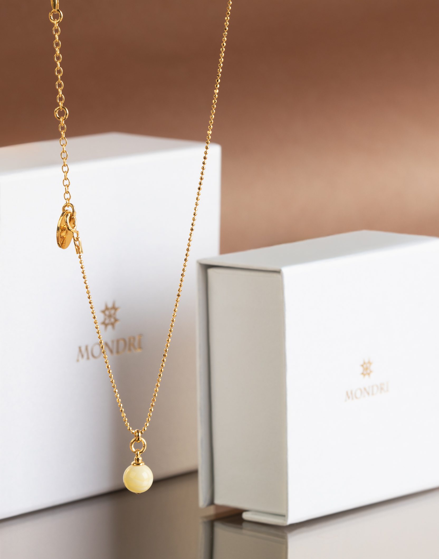 Minimalist amber necklace ROYAL WHITE – a delicate women’s necklace that works beautifully for everyday wear as well as special occasions. White amber tones feature natural uniqueness and distinctive patterns created by nature, adding a touch of effortless elegance to your look. 24k gold vermeil chain brings a soft, refined shine, making this necklace an easy accessory to pair with different styles.