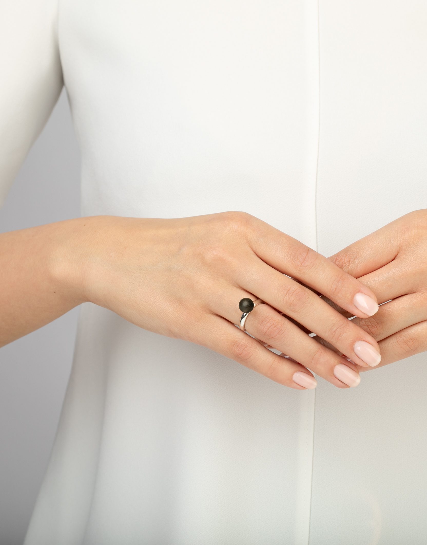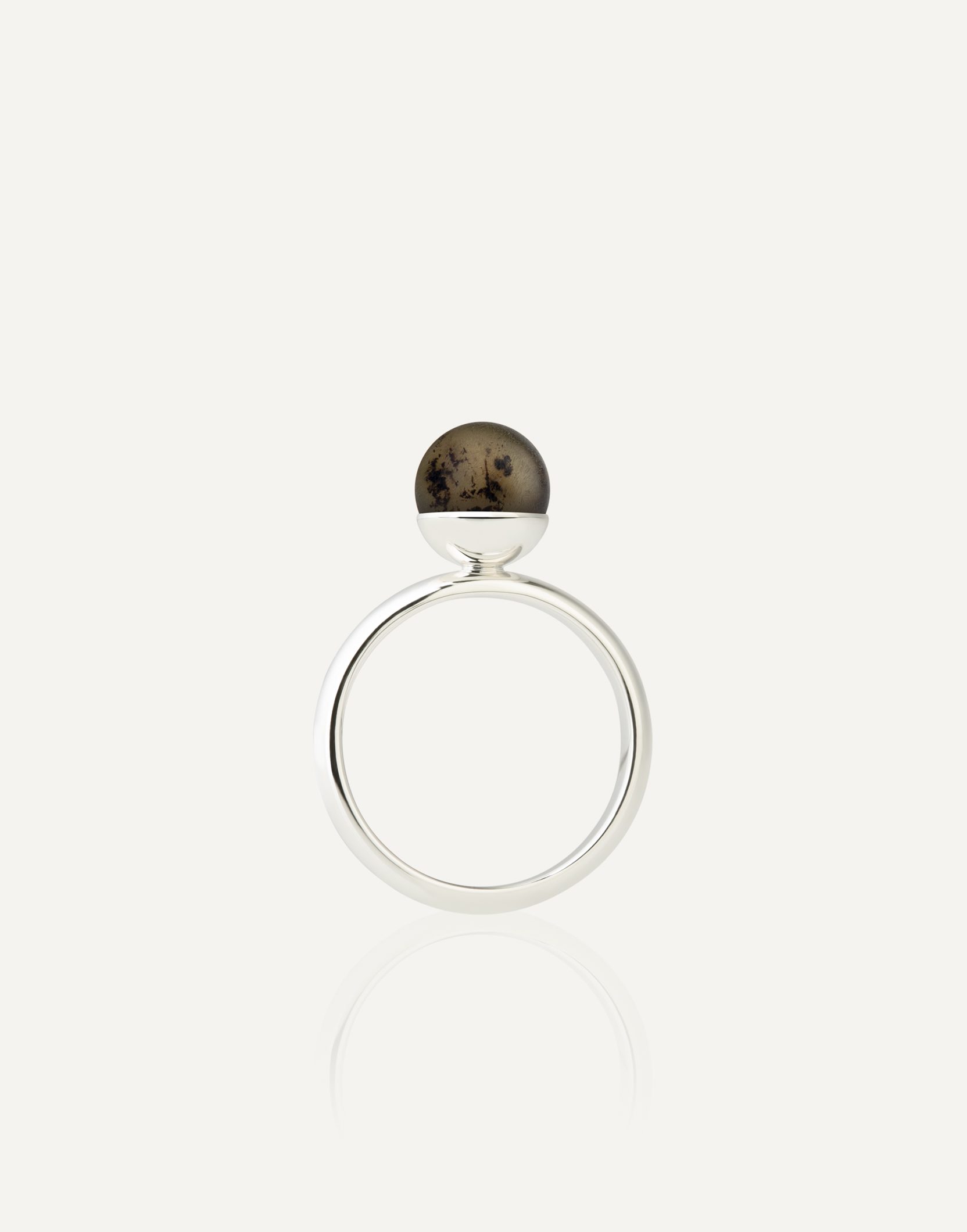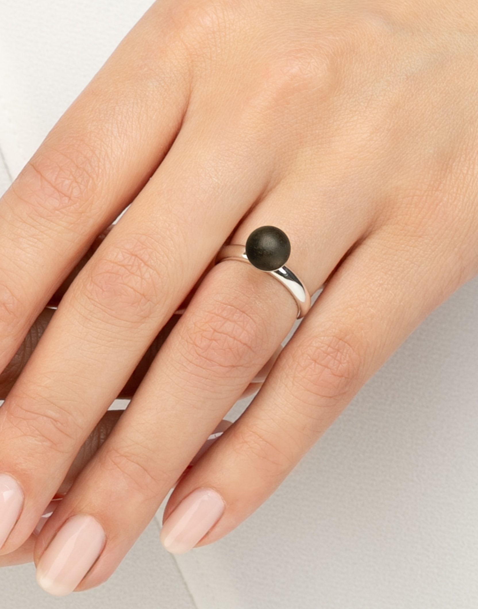 Sterling silver ring NERO with a modern black amber design is an exclusive accent that will expressively complement your style. Raw black amber of the ring is dry-polished by honing the surface of the amber. This polishing method gives the natural amber a matte, grayish hue, but over time, the earth’s color range emerges. This round amber ring is sure to add a touch of coziness to your daily look.