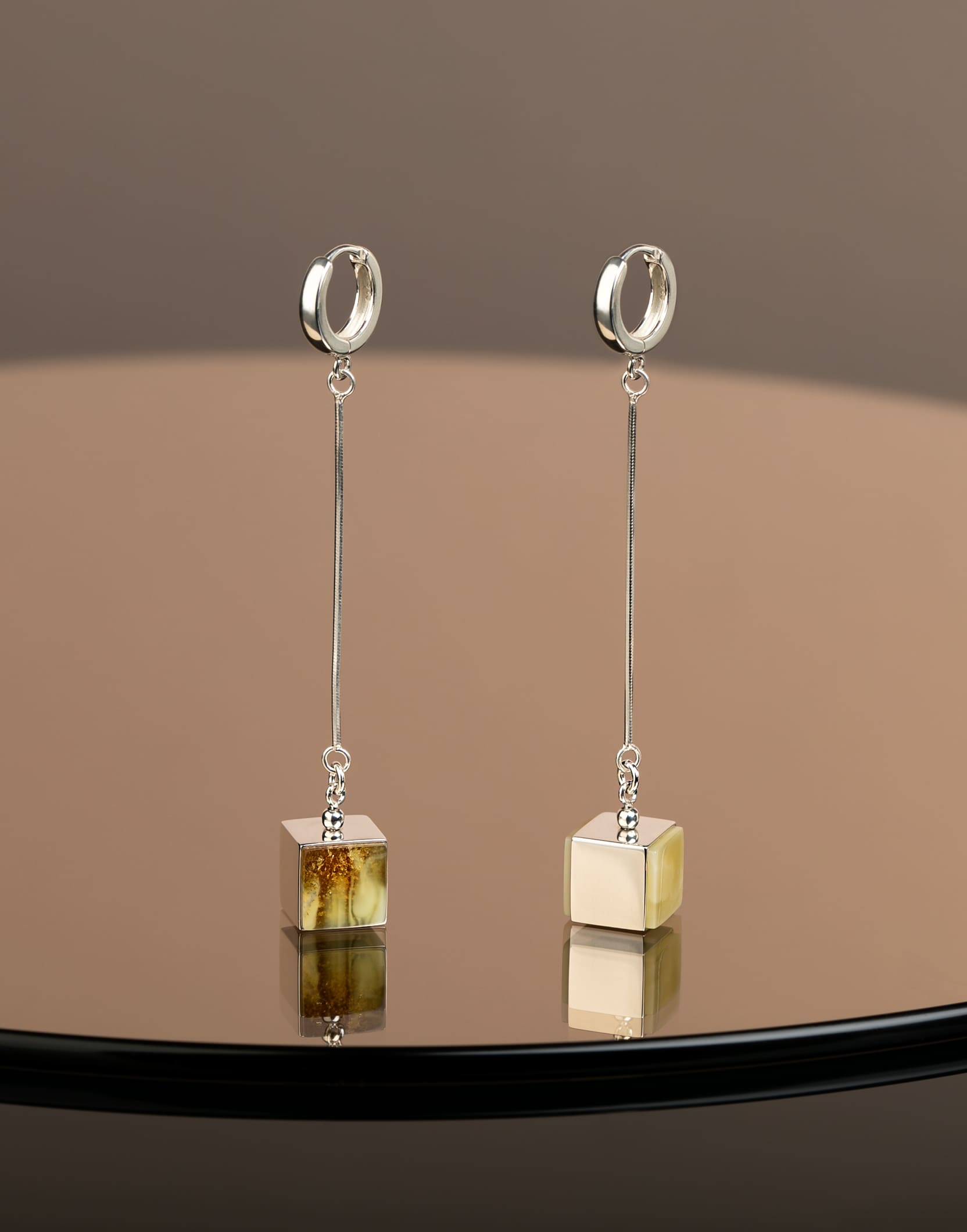 Ilgi kabantys sidabriniai auskarai su išskirtiniu gintaru – CUBICO