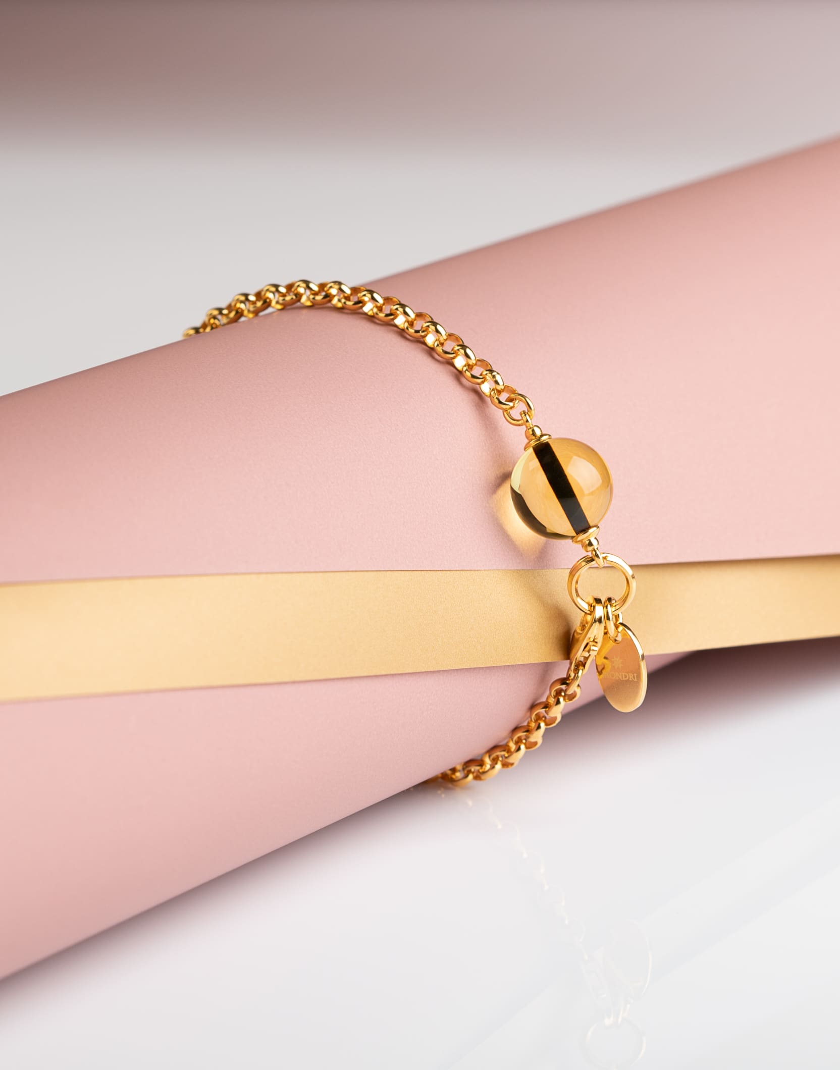 Minimalistinė apyrankė moterims TIGER – elegantiškas akcentas jūsų įvaizdžiui. Blizgiai poliruotas skaidrus gintaras su tamsintu vidumi, suteiks elegancijos tiek kasdieniam, tiek šventiniam stiliui. Medaus atspalvio gintaras pasižymi ypatingu tyrumu ir šiltais konjako tonais, kurie suteikia papuošalams subtilų prabangos įspūdį. Paauksuota grandinėlė ant rankos atrodys itin dailiai, o šilti gintaro atspalviai suteiks šilumos.