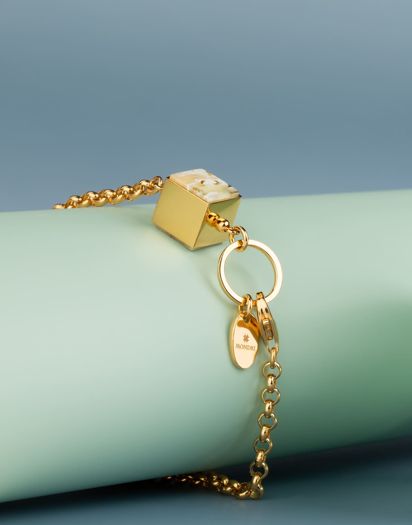 Prabangi apyrankė su gintaru CUBICO – modernus gintaro papuošalas, kuris neliks nepastebėtas. Precižiškas, griežtų formų dizainas ir išskirtinis Baltijos gintaro grožis sužavės iš pirmo žvilgsnio. Paauksuota grandinėlė ant rankos atrodys itin dailiai, o dėl jos lengvumo norėsis ją nešioti kasdien. Moderni apyrankė moterims gali būti pagaminta su liepų medaus atspalvio, peizažiniu ar itin baltu gintaru.