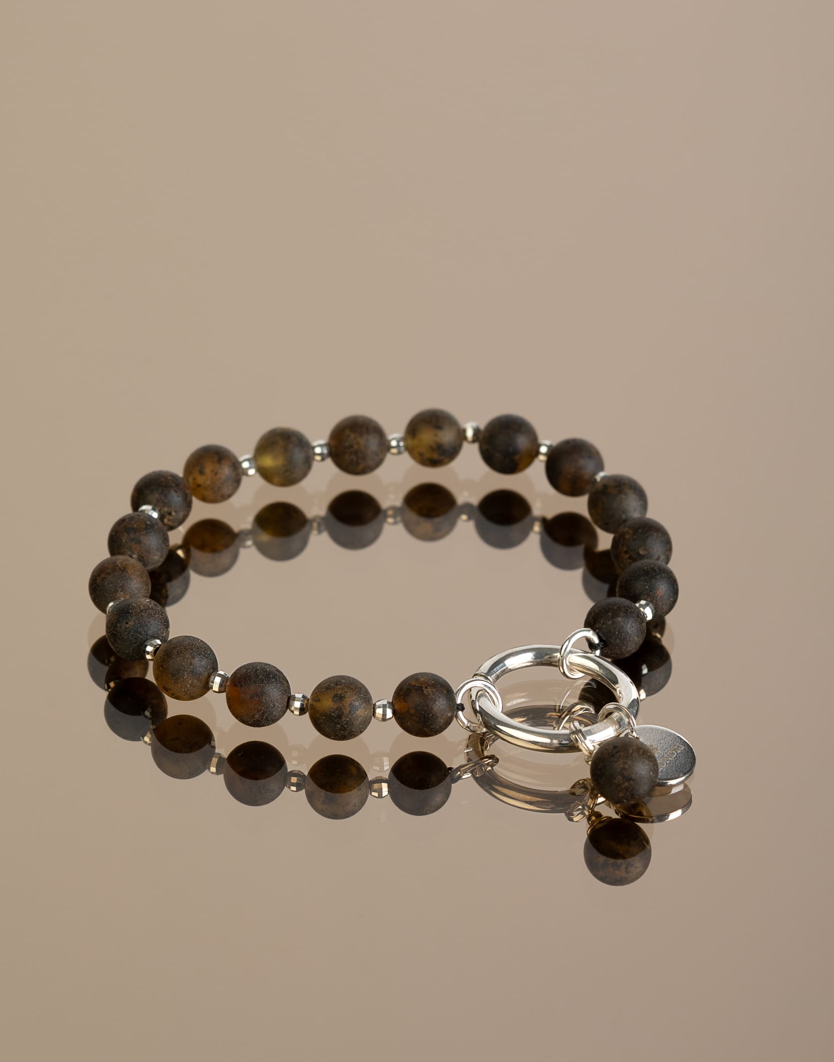Sidabrinė apyrankė iš juodojo gintaro NERO – stilingas ir jaukus papuošalas kasdienai. Juodo gintaro apyrankę bus itin lengva derinti prie įvairių drabužių, o sidabrinis apyrankės užsegimas – apvalus žiedelis, su minimalistiniais pakabukais, suteiks išskirtinumo ir žaismingumo. Gintarinės apyrankės natūralus juodas gintaras nupoliruotas matiškai – dėl šio poliravimo metodo juodasis gintaras tampa matinis, pilkšvo atspalvio, tačiau ilgainiui šilta žemės spalvų gama išryškėja.