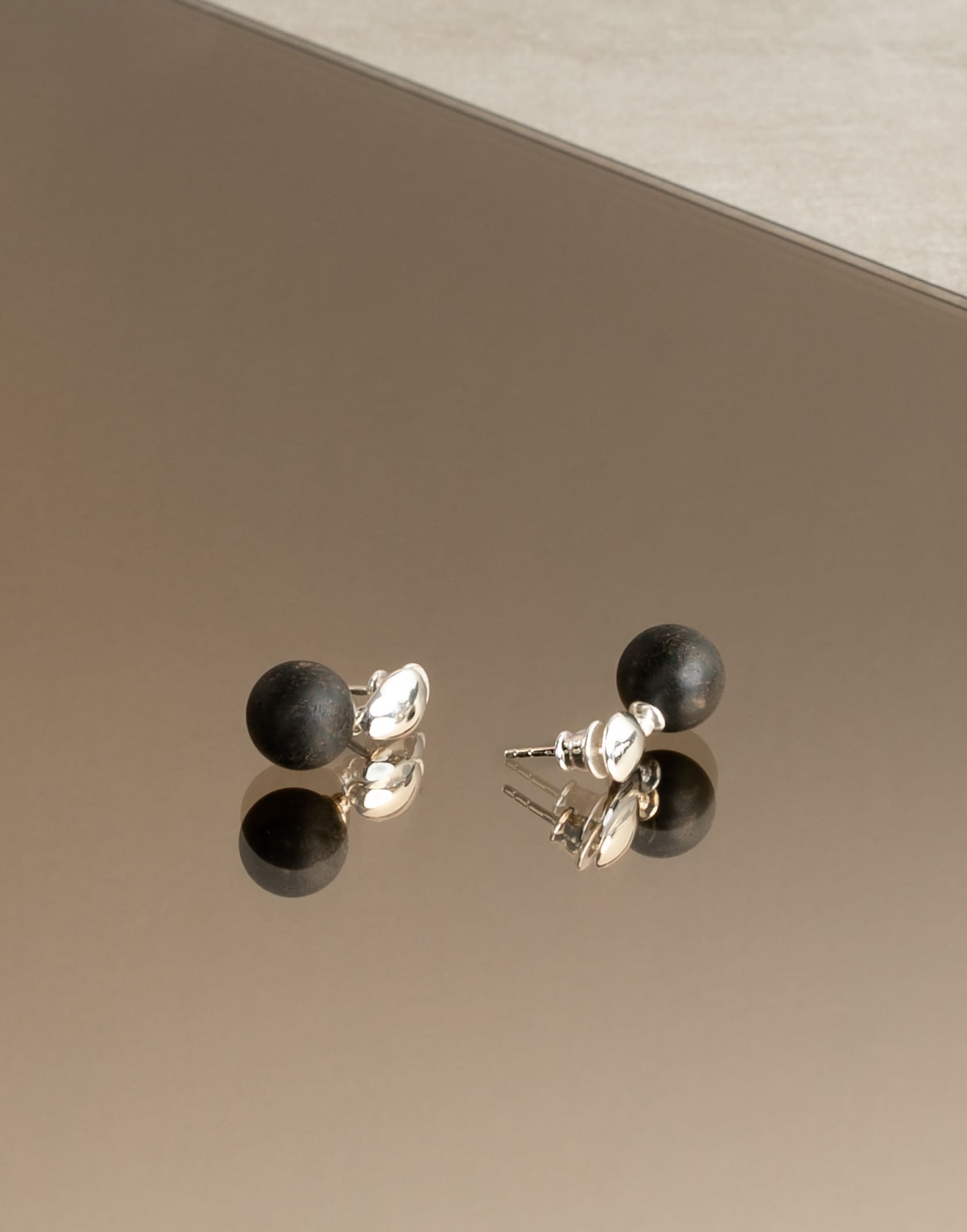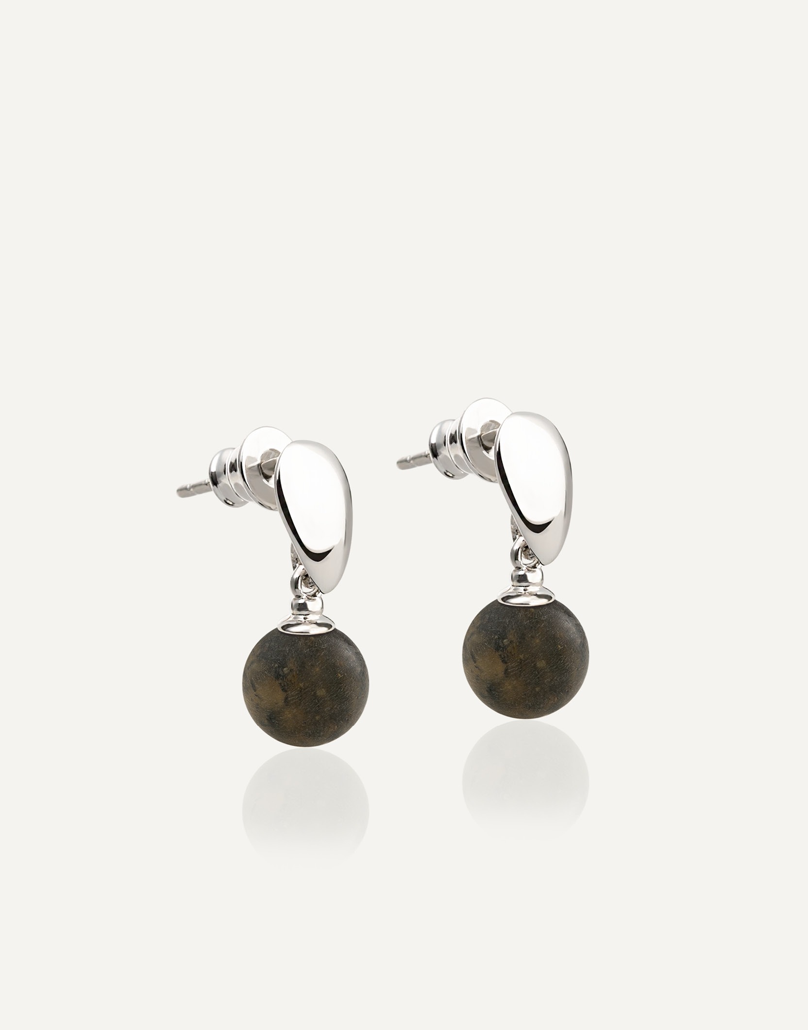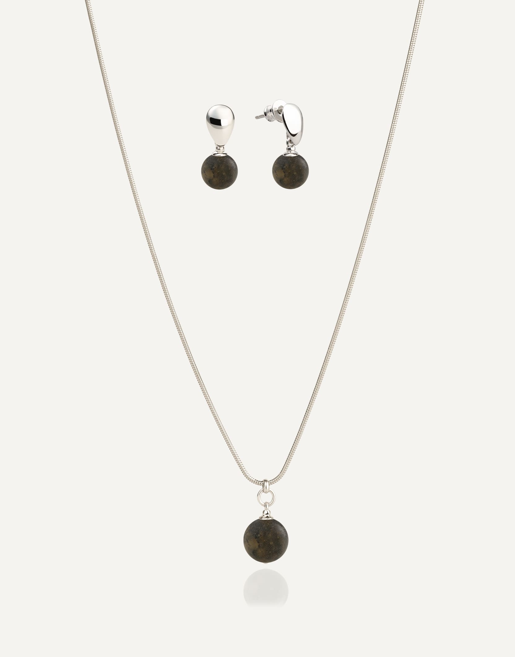 Sidabrinis koljė ir minimaliai kabančių auskarų su juodu gintaru papuošalų rinkinys – NERO