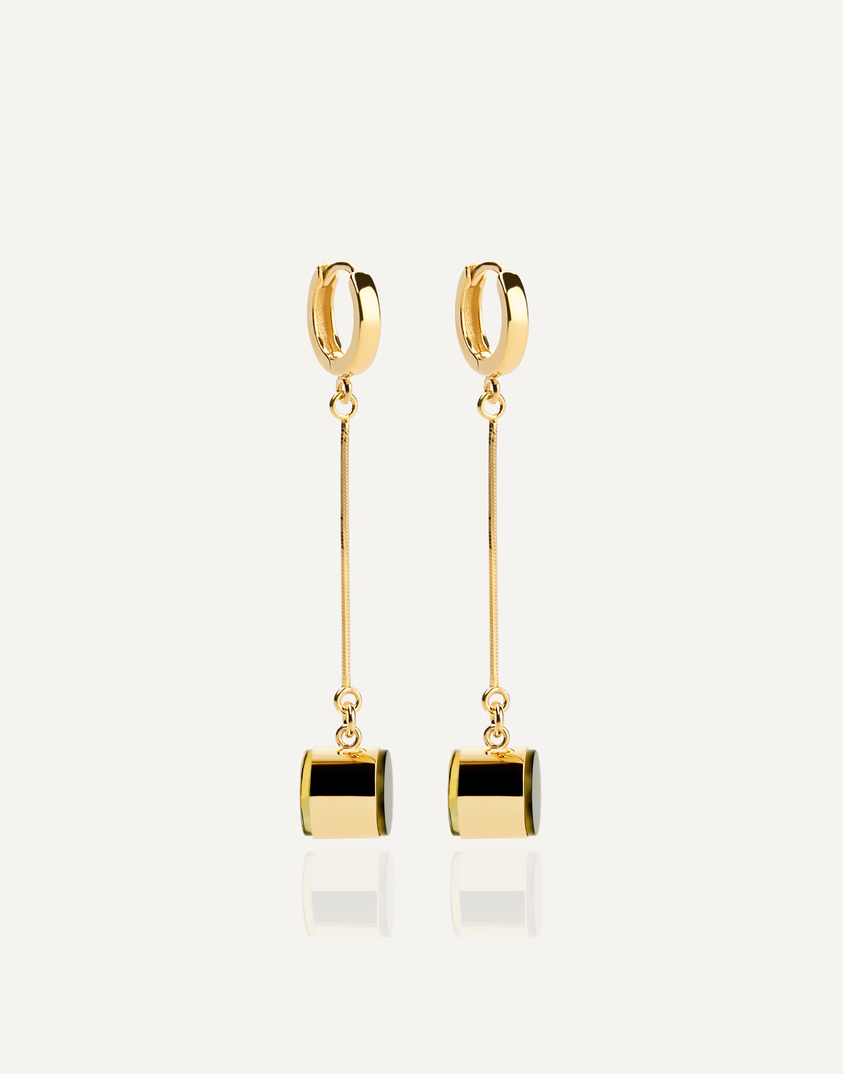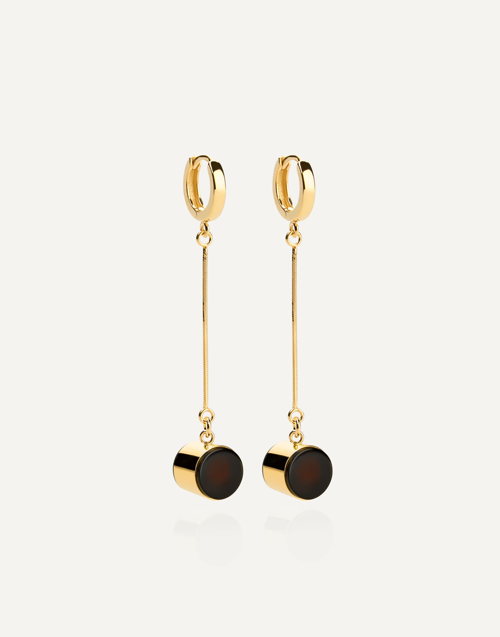 24K auksu paauksuoti, ilgi kabantys auskarai CALICE žavi preciziškai išbaigtomis cilindro formos detalėmis, kurios įrėmina sodriai vyšninį Baltijos gintarą, atsiskleidžiantį paslaptingu gyliu ir išryškinantį skaidrų briaunų efektą. Rankų darbo, cilindro formos auskarai, pagaminti iš aukštos kokybės medžiagų, išsiskiria šiuolaikišku dizainu ir futuristine elegancija ir prabanga.