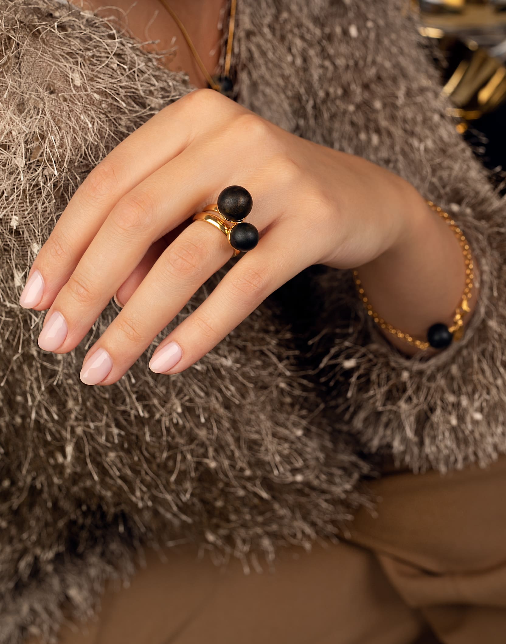 Juodojo gintaro ir 24K auksu dengto sidabro papuošalų rinkinys GOLDEN NERO – tai subtilus akcentas, kuris įvaizdžiui suteikia ramios elegancijos. Auskarai su matinio paviršiaus juoduoju gintaru puikiai dera tiek šventinėse, tiek jaukiose kasdienybės situacijose. Apvalus, patogus užsegimas leidžia mėgautis jų lengvumu be jokio diskomforto.