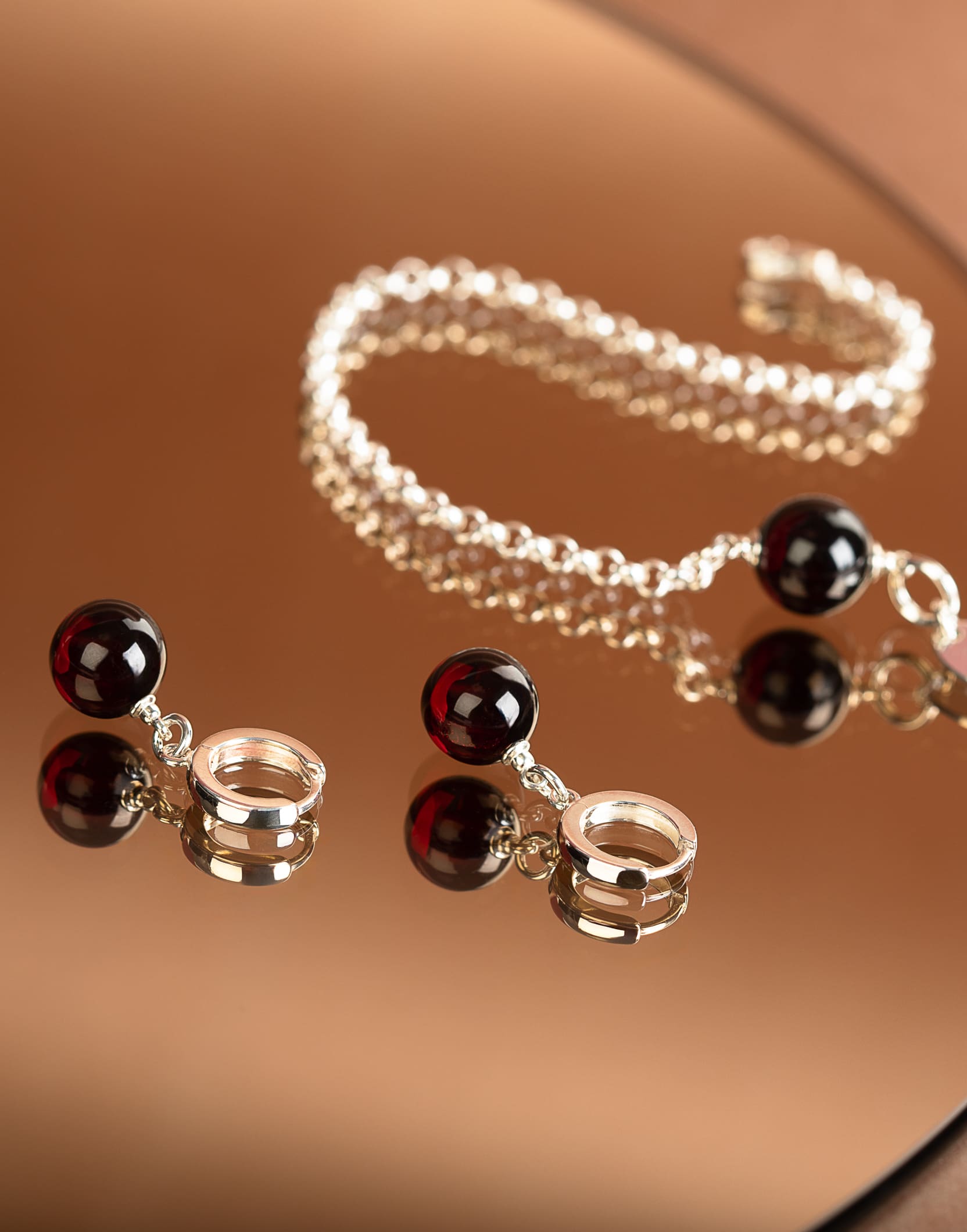 Sidabrinis koljė, kabančių auskarų ir apyrankės papuošalų rinkinys su vyšniniu gintaru – CHERRY