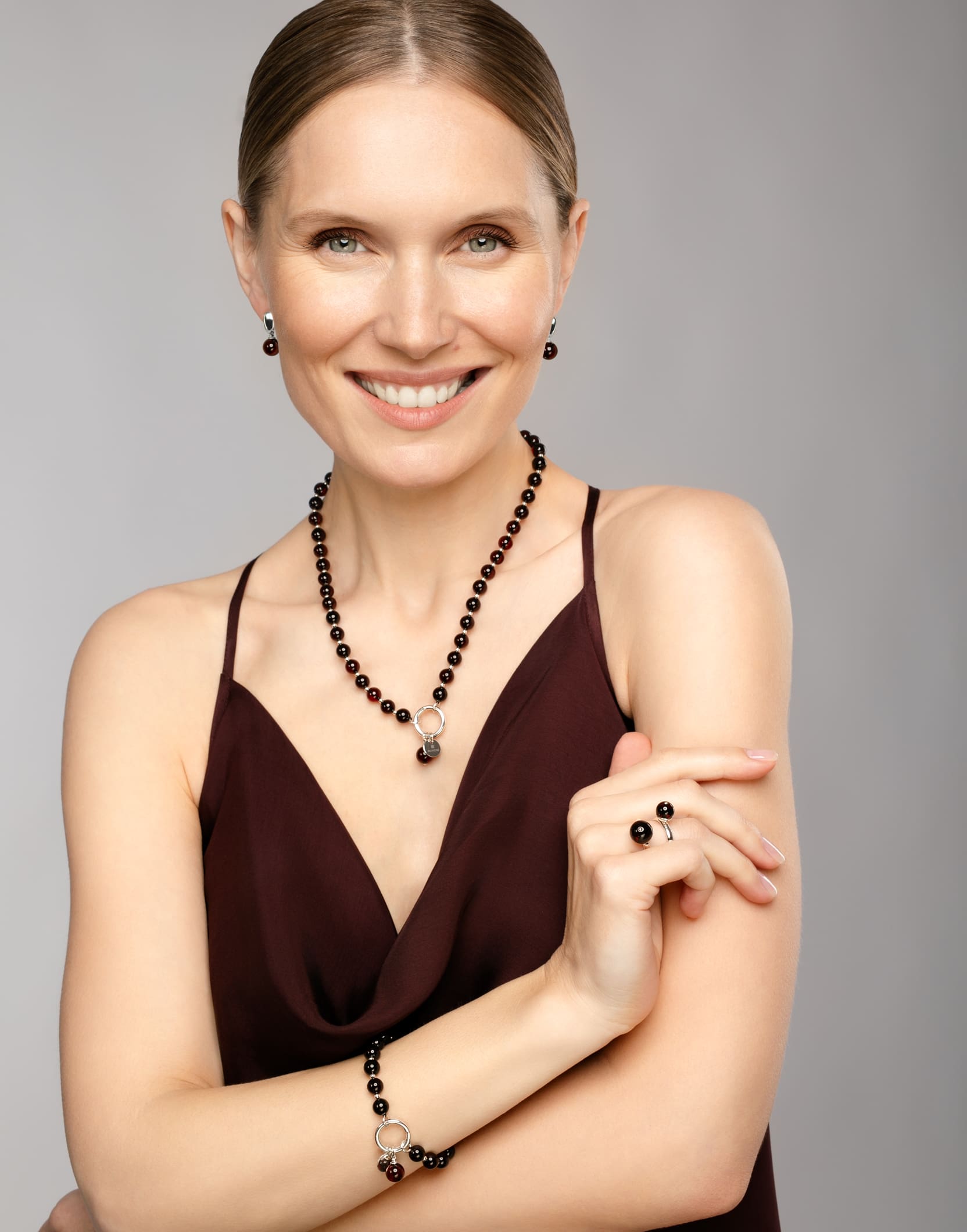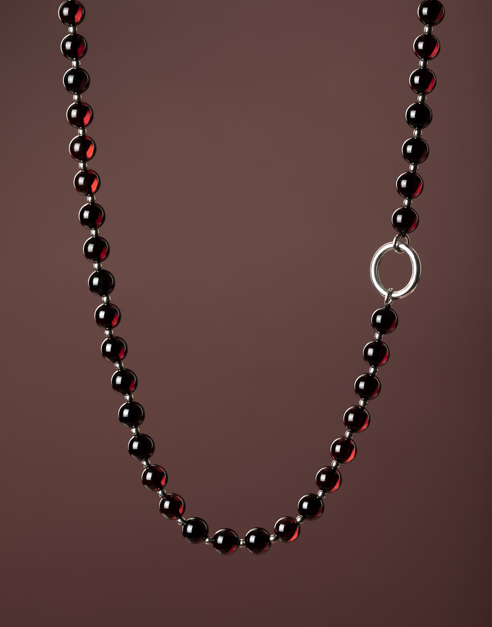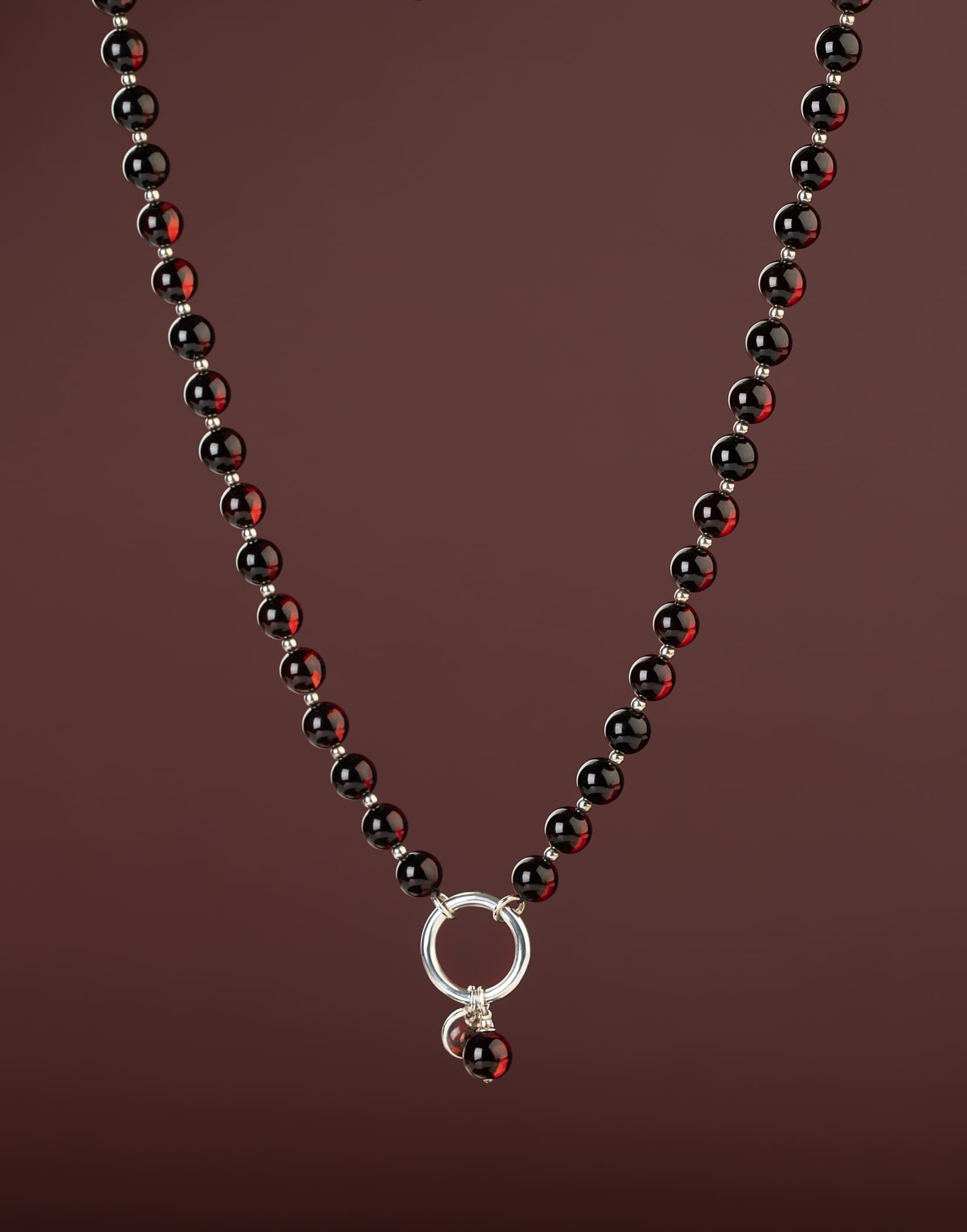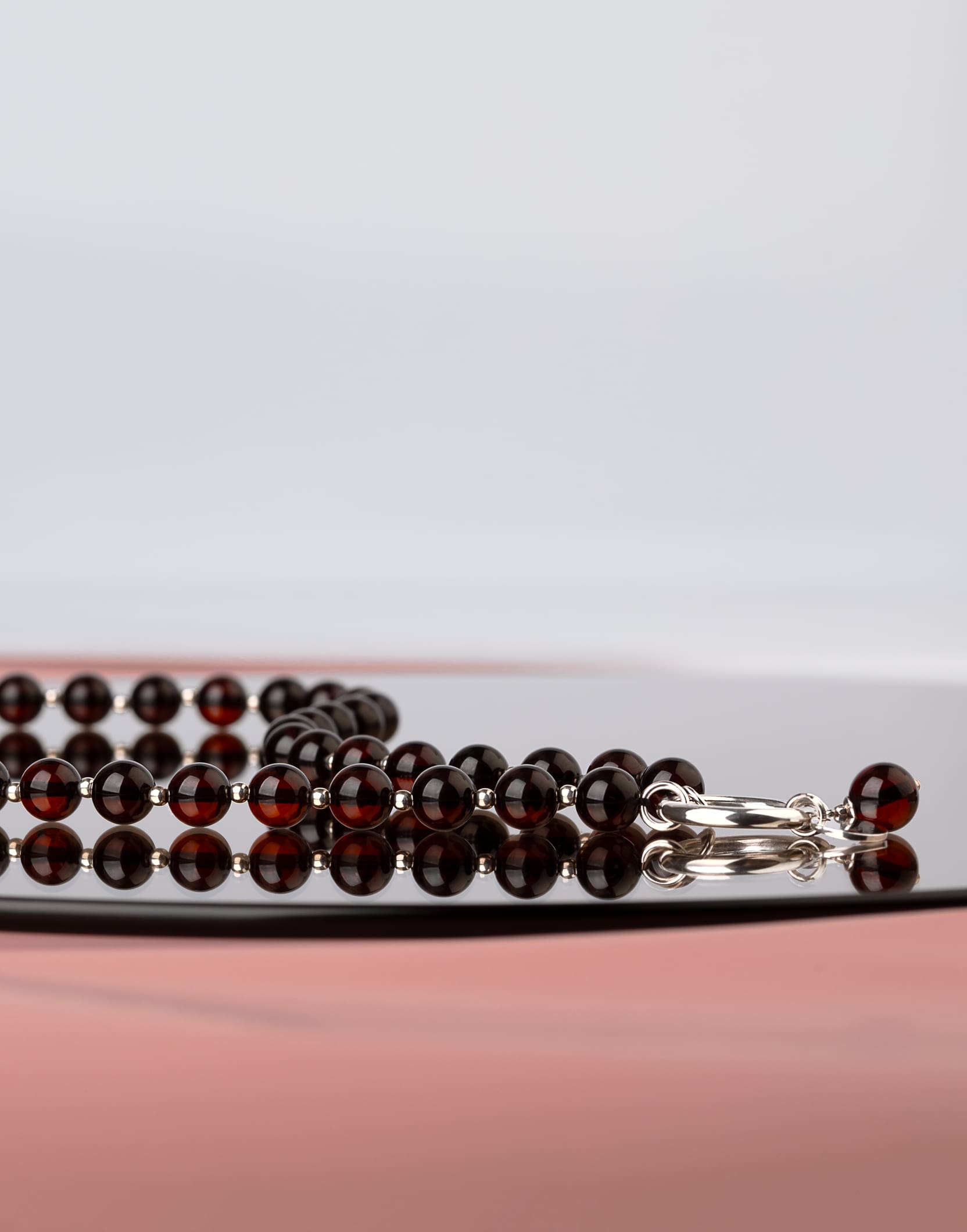 Vėrinys moterims CHERRY – papuošalas, kuris suteiks jums subtilios prabangos. Trumpi gintaro karoliai ant kaklo atrodys dailiai ir elegantiškai. Šį vėrinį iš gintaro karoliukų priderinsite ne tik prie šventinio įvaizdžio, bet ir prie kasdienio. Dėl tamsios vyšninės gintaro spalvos ir subtiliai priderintų sidabro detalių, šis kaklo papuošalas lengvai derės prie įvairių drabužių. Blizgiai poliruotas raudono gintaro paviršius gali atrodyti itin tamsus, beveik juodas, tačiau žiūrint prieš šviesą atsiskleidžia sodria vyšnine spalva.