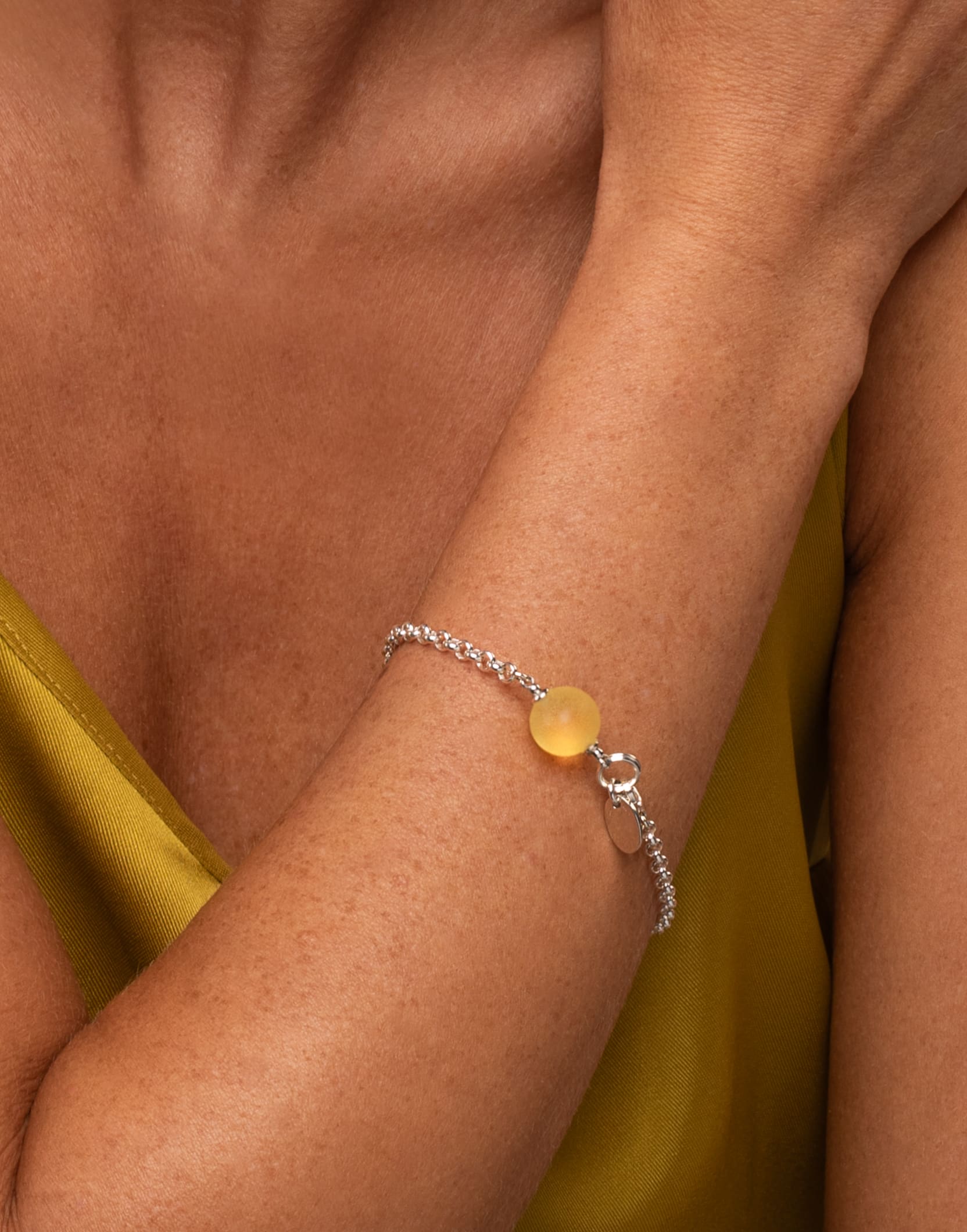 Subtilaus dizaino moteriška sidabrinė apyrankė LEMON – elegantiškas akcentas kasdienai. Minimalistinės apyrankės gintaro paviršius nupoliruotas sausu būdu, pašiaušiant gintaro paviršių. Dėl šio poliravimo metodo geltonas gintaras atrodo matinis, neperregimas. Sidabro apyrankės grandinėlė ant rankos atrodys itin dailiai, o šiltas gintaro atspalvis suteiks jaukumo ir šilumos.