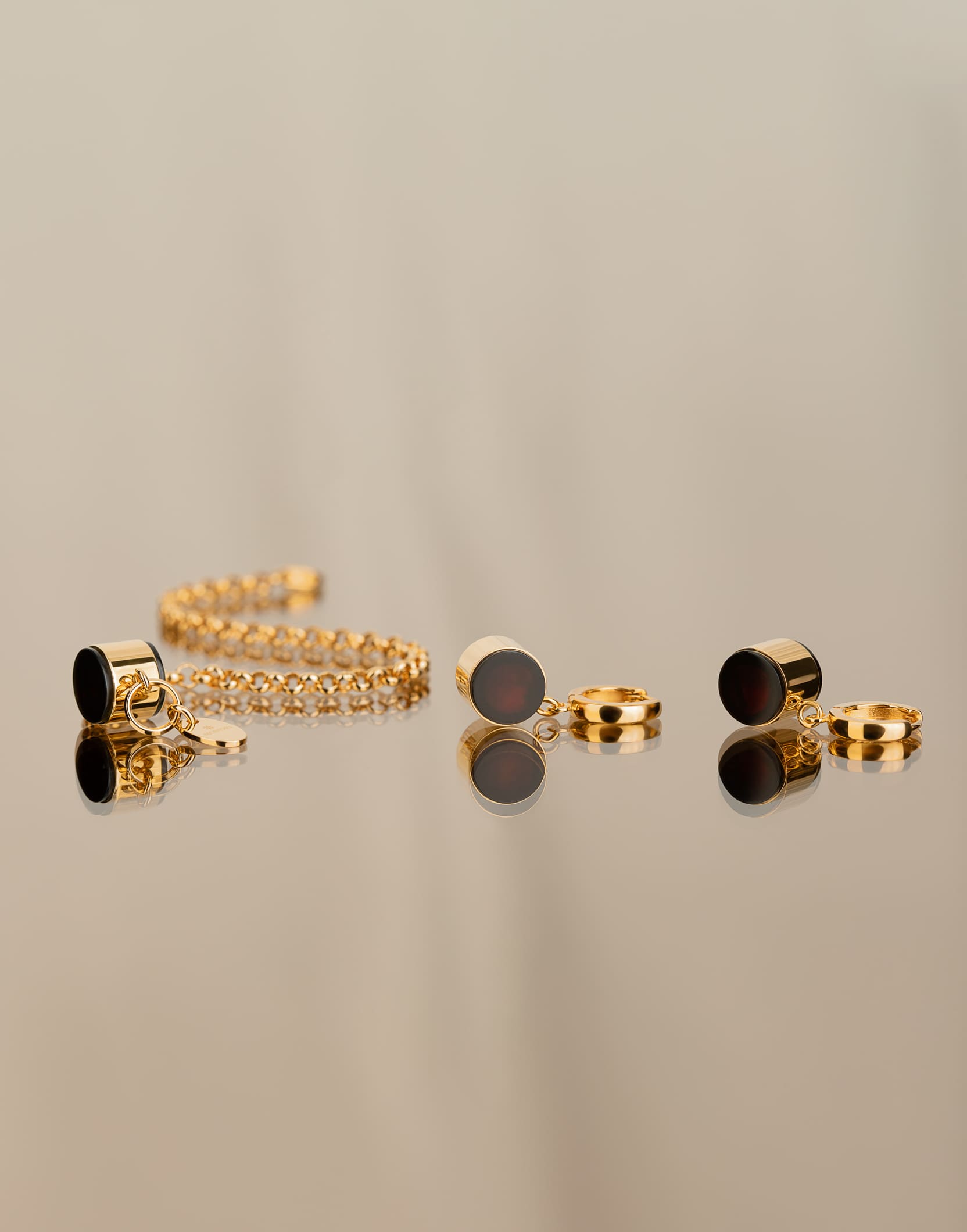 Paauksuotas auskarų, apyrankės ir žiedo rinkinys su tamsiu gintaru – CALICE