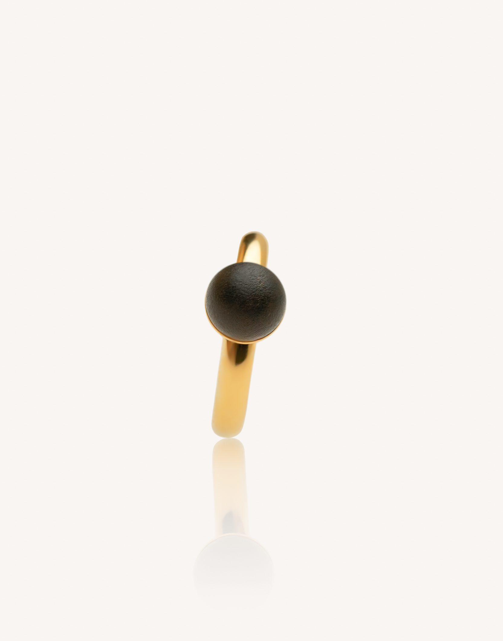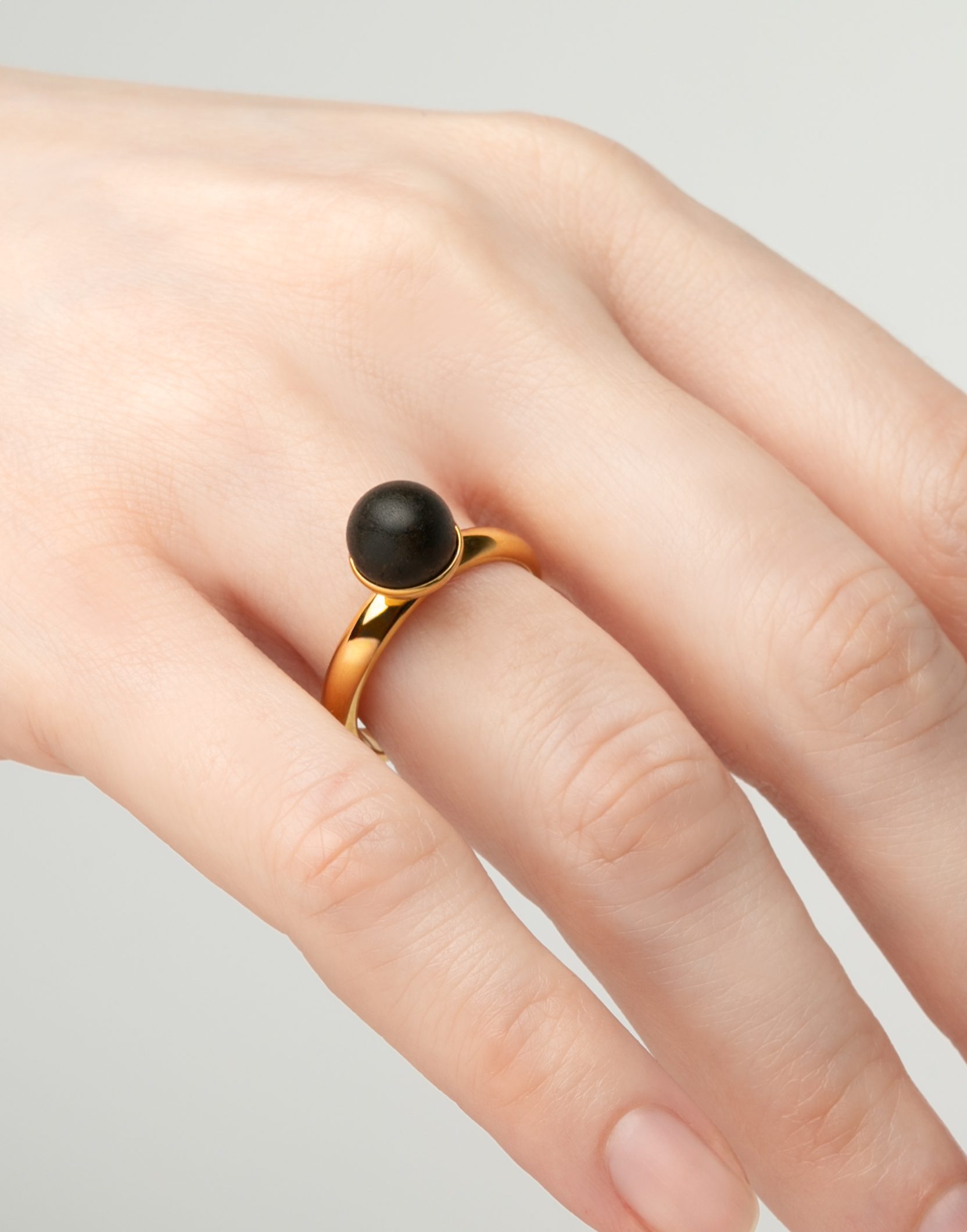Minimalistinio dizaino 24K auksu paauksuotas žiedas GOLDEN NERO – jaukus akcentas, kuris išraiškingai papildys jūsų elegantišką stilių. Natūralus juodas gintaras nupoliruotas matiškai – dėl šio poliravimo metodo juodasis gintaras tampa matinis, pilkšvo atspalvio, tačiau ilgainiui šilta žemės spalvų gama išryškėja. Komfortiška žiedo forma ir minimalistinis gintaro akcentas, kuria jaukų įvaizdį, kuris puikiai tiks kasdienai.
