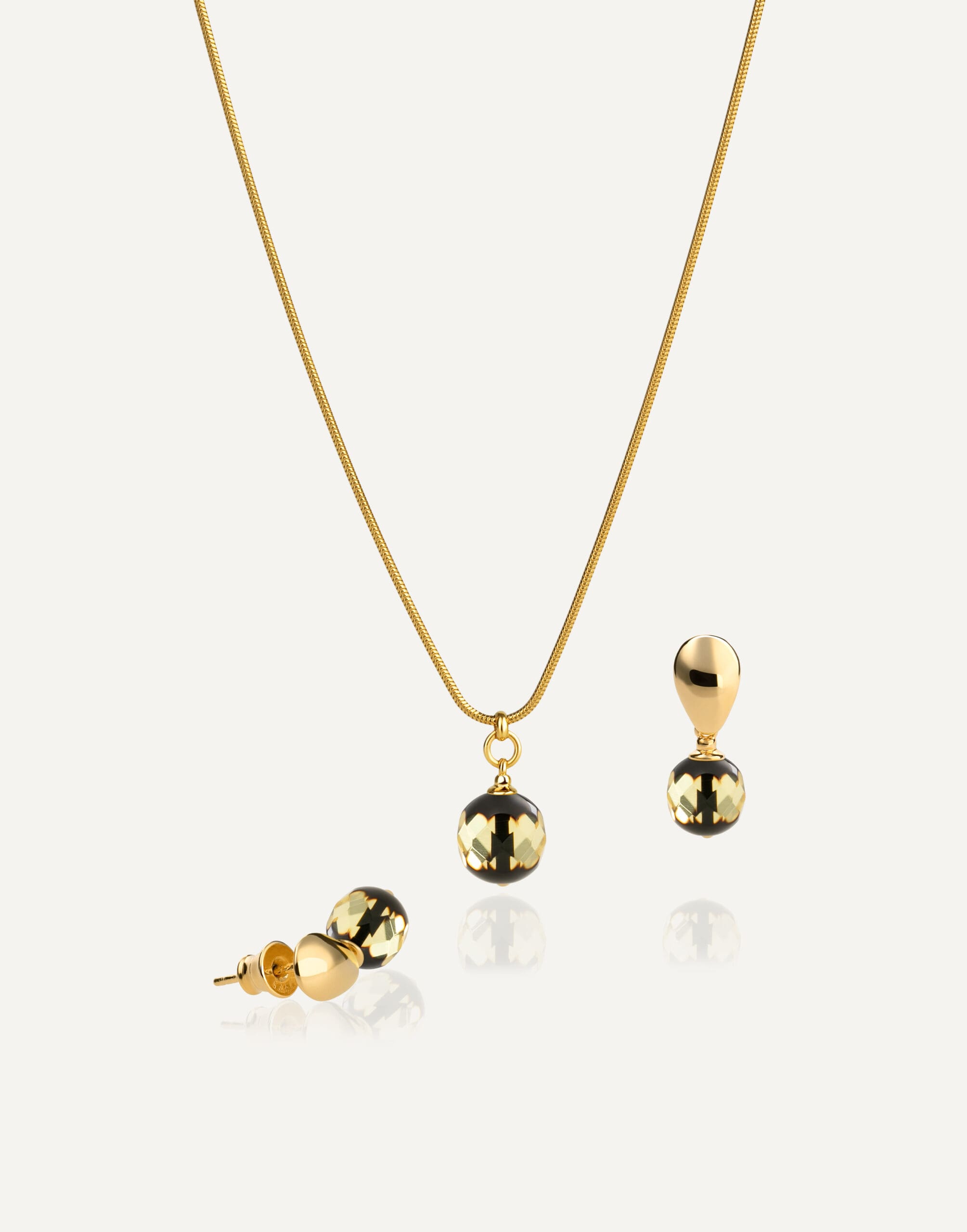 Paauksuotas koljė ir minimaliai kabančių auskarų rinkinys su facetuotu gintaru – BLISS