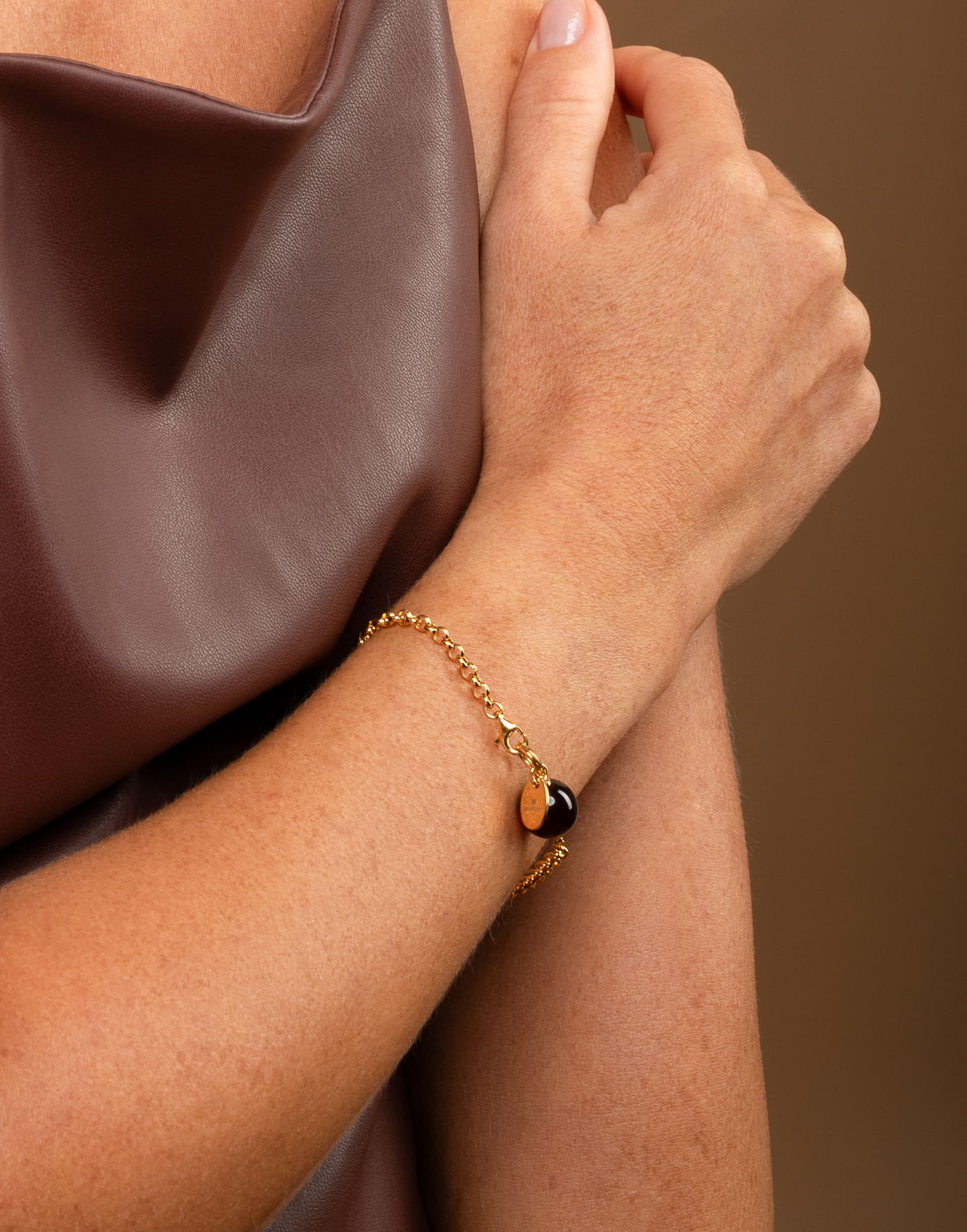 Subtilaus dizaino vyšninio/raudono gintaro apyrankė moterims GOLDEN CHERRY – elegantiškas akcentas kasdienai. Blizgiai poliruotas gintaro paviršius gali atrodyti itin tamsus, beveik juodas, tačiau žiūrint prieš šviesą atsiskleidžia sodria vyšnine spalva. Minimalistinė apyrankė puikiai derės prie kasdienio stiliaus, paauksuota grandinėlė ant rankos atrodys itin dailiai, o tamsiai raudonas gintaras žavės paslaptingumu.