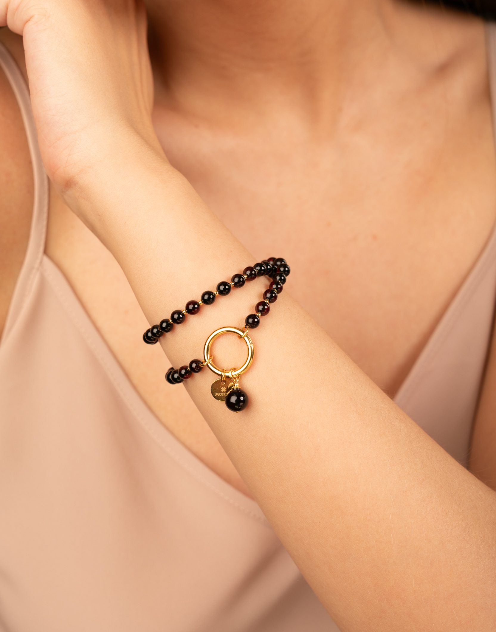 Apyrankė moterims su gintaru BLACK CHERRY – elegantiška įvaizdžio detalė, kuri puikiai tiks tiek kasdienai, tiek švenčių metu. Išskirtinumo gintarinės apyrankės dizainui suteikia apvalus žiedo formos užsegimas, o tamsiai raudonas gintaras žavi paslaptingumu. Blizgiai poliruotas gintaro paviršius gali atrodyti itin tamsus, beveik juodas, tačiau žiūrint prieš šviesą atsiskleidžia sodria vyšnine spalva.