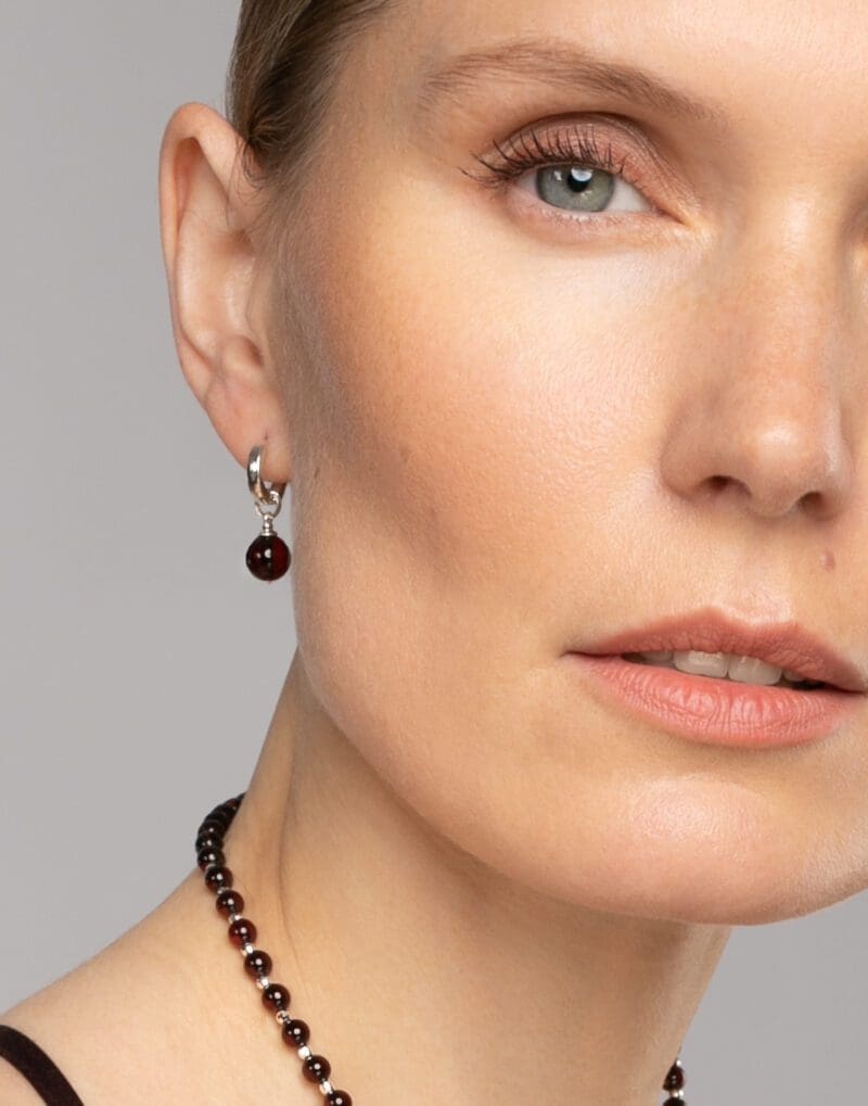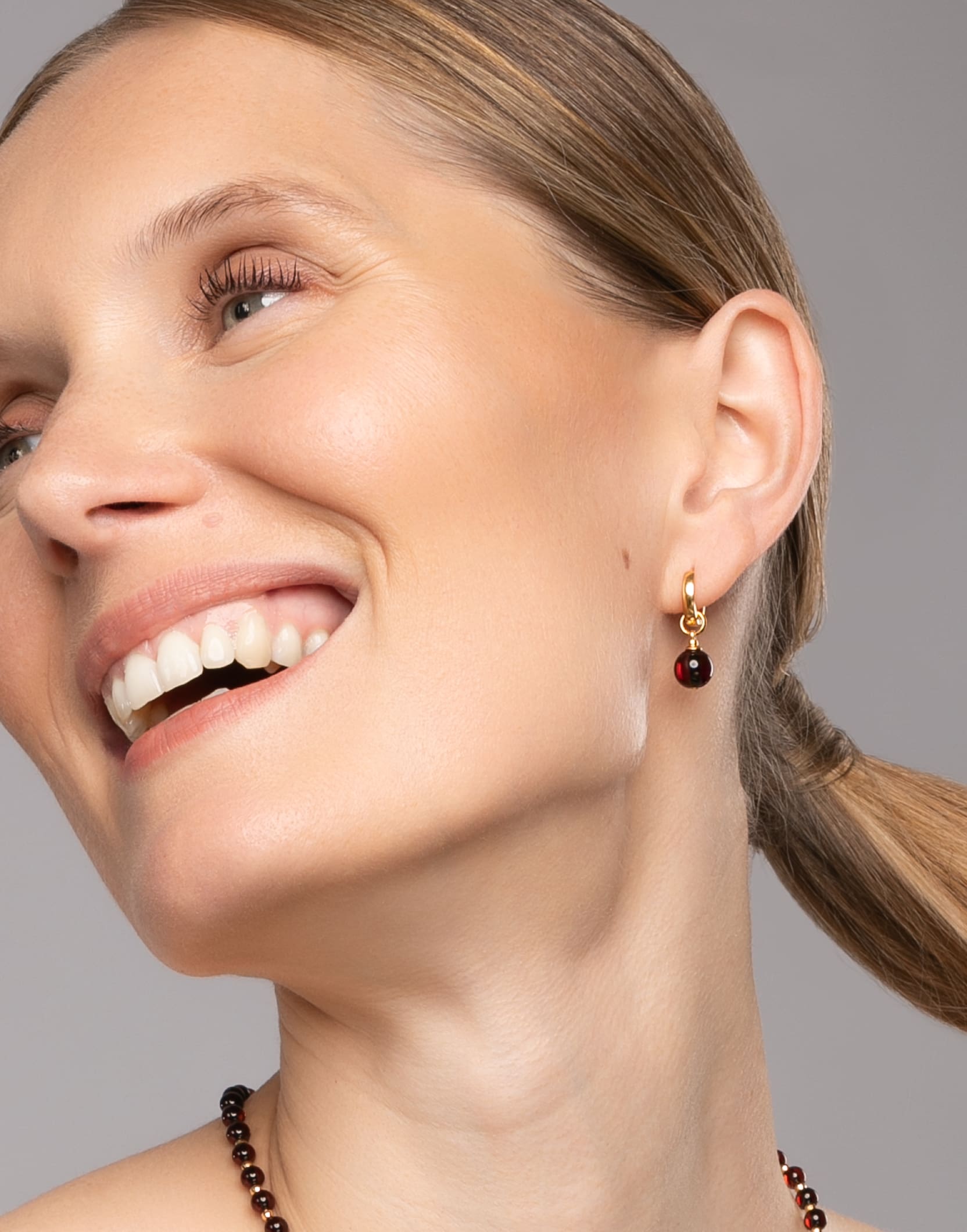 Paauksuoti auskarai HOOP su tamsiai raudonu gintaru – GOLDEN CHERRY
