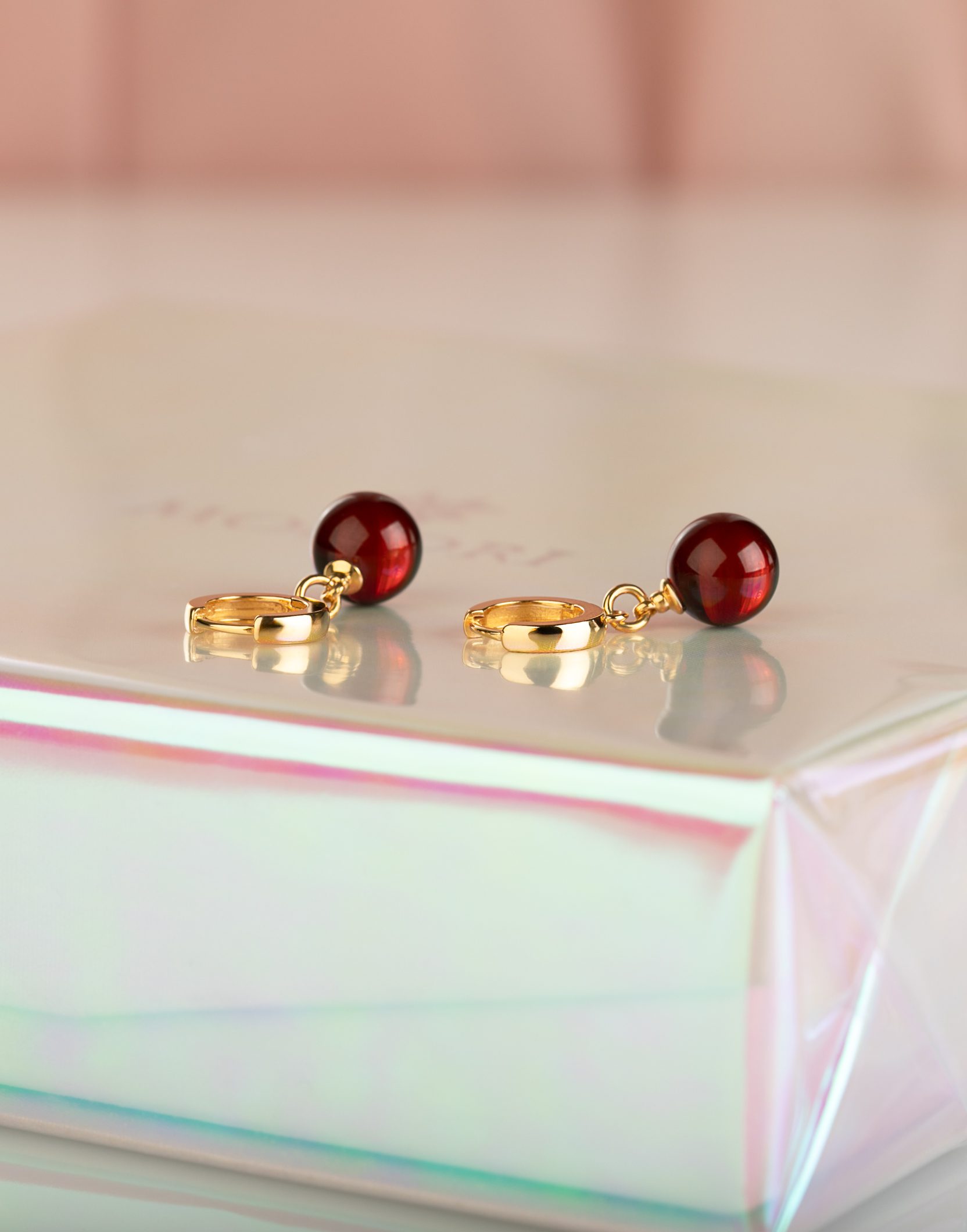 Paauksuoti vyšninio/raudono gintaro auskarai GOLDEN CHERRY – elegantiškas akcentas jūsų įvaizdžiui. Itin patogus apvalus kabančių auskarų užsegimas leis jais mėgautis kasdien. Gintaro auskarų blizgiai poliruotas paviršius gali atrodyti itin tamsus, tarsi juodas, tačiau žiūrint prieš šviesą atsiskleidžia sodria vyšnine spalva.
